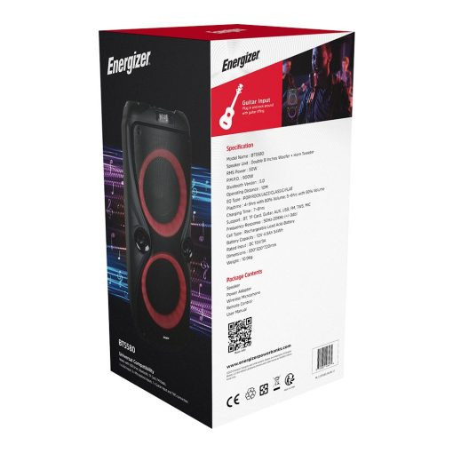 از مهمترین ویژگیهای اسپیکر انرجایزر مدل BTS580 میتوان به سایز دو ووفر 8 اینچی به همراه یک هورن توییتر اشاره کرد. همچنین دارای توان خروجی 50 وات و توان لحظهای 900 وات است که مقدار قابل توجهی است. یکی دیگر از ویژگیهای مورد پسند این محصول، مربوط به نورپردازی آن است که دارای 3 افکت رنگی متنوع هنگام پخش است. مورد دیگری که میتوان بعنوان ویژگی پرطرفدار به آن اشاره کرد، قابلیت پشتیانی از AUX , USB به همراه قابلیت اتصال به گیتار است. باتری این اسپیکر همچنین از نوع لید اسید قابل شارژ با ظرفیت 12 ولت 4.5Ah است.