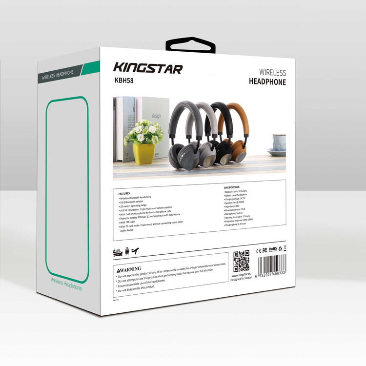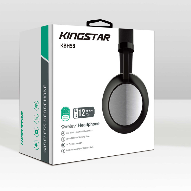 یکی از این محصولات هدفون بی سیم کینگ استار مدل KBH58 است. این هدست در دسته هدستهای بی سیم و بلوتوثی قرار میگیرد و با استفاده از فناوری بلوتوث شما میتوانید پلیر های خود را به آن متصل نمایید. همچنین این کمپانی به سایر کاربرانی که دیوایس های آنها از فناوری بلوتوث پشتیبانی نمیکند توجه نموده است. شما می توانید از این هدست به صورت با سیم به وسیله ی یک جک 3.5 میلی متری استفاده نمایید و از موسیقی لذت ببرید. کاپ های صدای این محصول کارامد کمپانی کینگ استار به قطر 40 میلی متر هستند.