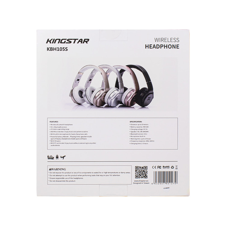 این محصول زیبا و شیک شرکت کینگ استار با ظرفیت باتری داخلی لیتیوم قابل شارژ 400 میلیآمپر یک میکروفون داخلی با قابلیت مکالمه همانند هندزفری را نیز داراست. همچنین زمان پخش موسیقی این محصول با ولتاژ شارژ 5 ولت تا 4 ساعت در حالت اسپیکر و تا 10 ساعت در حالت هدفون با 50٪ حجم صدا است. هدبند این محصول با پلاستیک چرم پوشانده شده است. قابلیت افزایش یا کاهش ارتفاع در این قسمت آن را برای استفاده هر کاربری مناسب میکند. هدفون اسپیکر بیسیم کینگ استار مدل KBH105S فرکانس 20 هرتز تا 18 کیلوهرتز را ساپورت میکند.