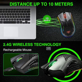 **فناوری بیسیم 2.4G** - بیسیم 2.4 گیگاهرتزی اتصال پایدار و دقت ردیابی را ارائه میدهد. با اتصال گیرنده USB به پورت USB، میتوانید در هر زمان و مکانی از آن استفاده کنید، بدون تاخیر و تداخل. لطفاً توجه داشته باشید که فاصله اتصال 2.4G نباید بیش از 10 متر باشد.